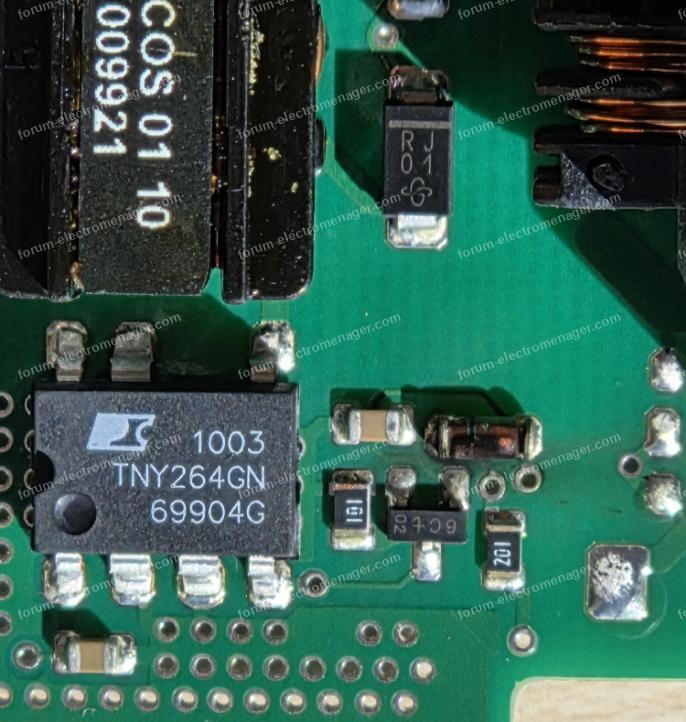 Le module de commande est hors service (référence Melecs 9000 407 352 EPG60120) et le "fusible" à côté du TNY264GN a surchauffé.
