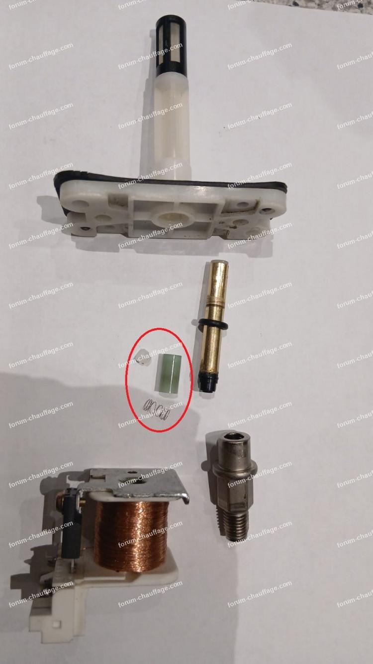 Pour nettoyer la pompe magnétique de mon poêle à pétrole, j'ai démonté celle-ci mais je ne me rappelle plus du tout comment et dans quel sens et ordre remonter les 3 petites pièces entourés en rouge sur la photo.