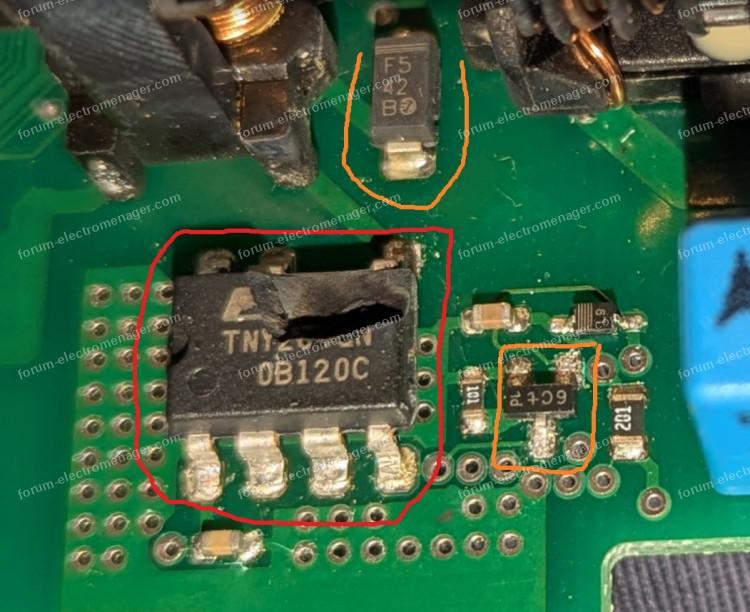 Et oui la photo montre le transistor MOSFET de puissance du TNY explosé ; c'est hélas connu.