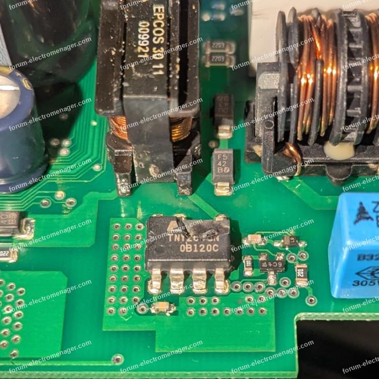 - Je suspecte enfin les deux composants (F5 42 diodes ?) qui sont callé entre les deux inductances au dessus du TNY264GN